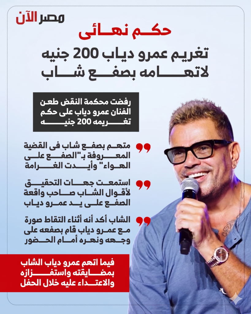 في حكم نهائي وبات غير قابل للطعن، أسدلت محكمة النقض المصرية الستار على القضية التي شغلت الرأي العام المصري طوال الأشهر الماضية، والمعروفة إعلامياً بـ “صفعة عمرو دياب”.