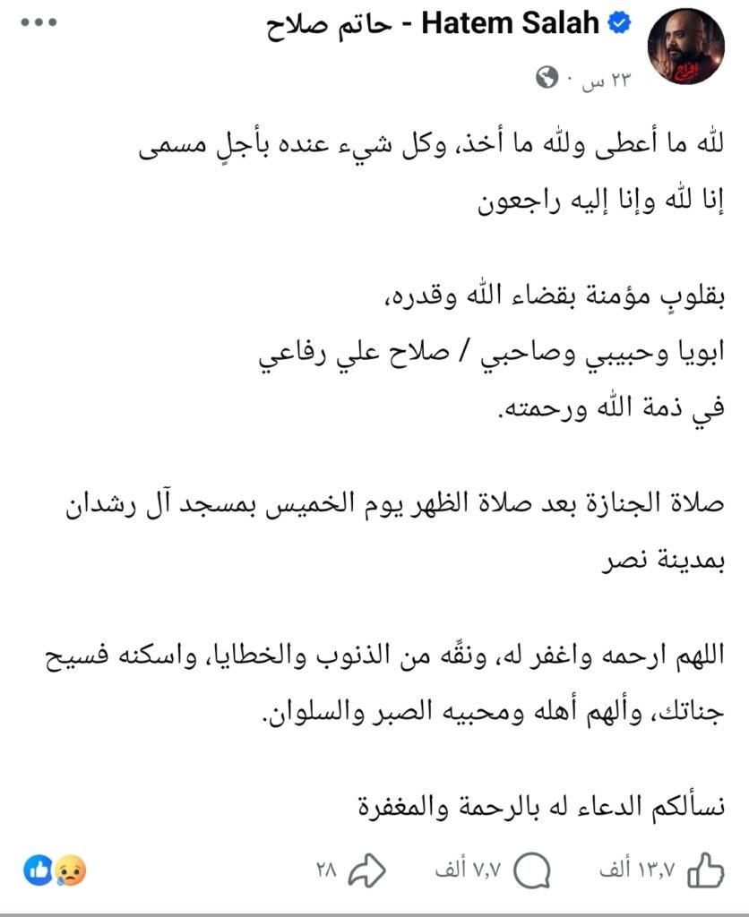 نعي مؤثر: وكان الفنان حاتم صلاح قد أعلن خبر الوفاة عبر حساباته على مواقع التواصل الاجتماعي، لتنهال عليه برقيات التعازي من زملائه في الوسط الفني والجمهور، داعين للمتوفي بالرحمة والمغفرة ولأسرته بالصبر والسلوان .